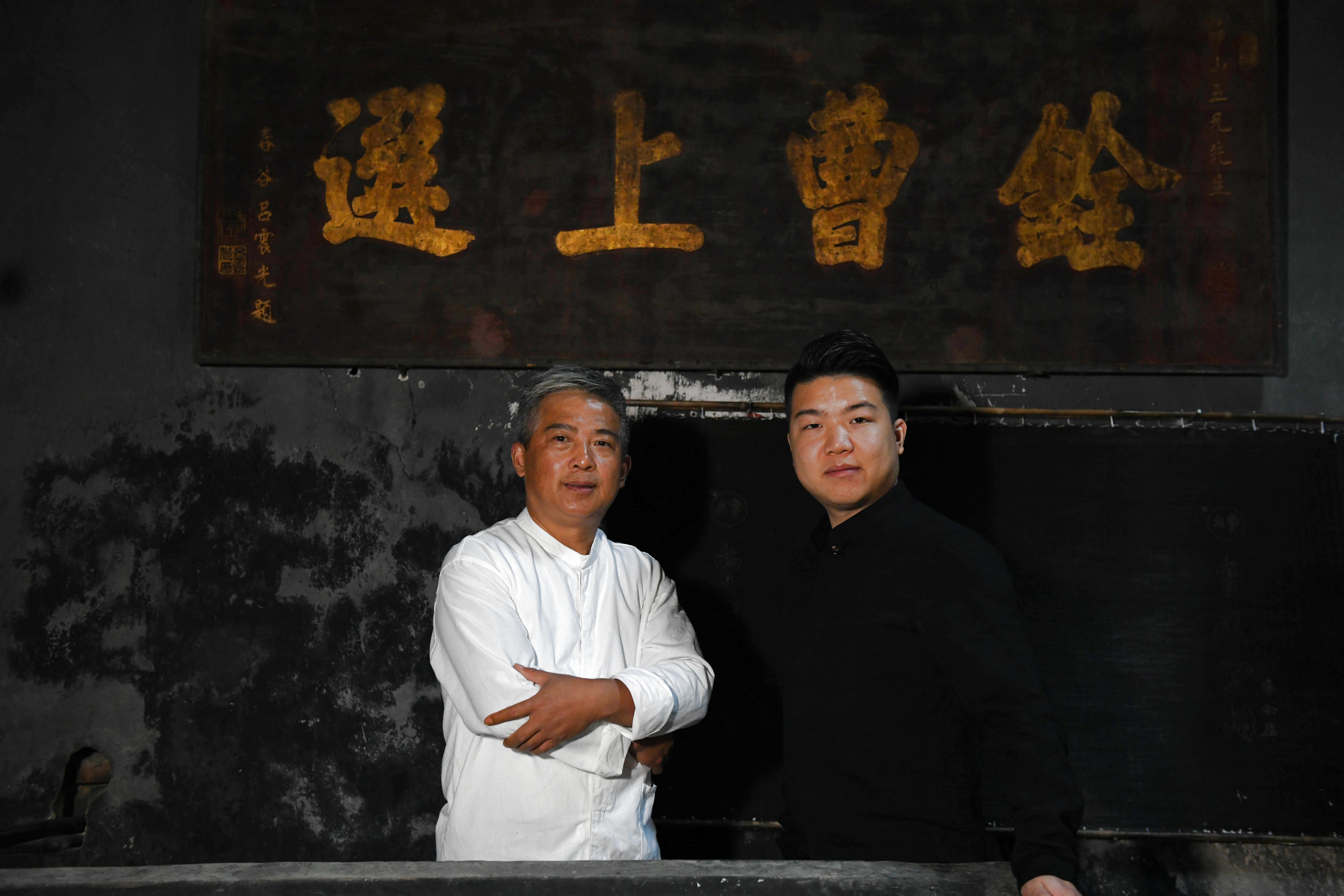 Cao Jianqin (L) and his son Cao Li pose for a photo at the Zijinlou Xuan paper factory in Jingxian County, Xuancheng City of east China's Anhui Province, Nov. 8, 2019. (Xinhua/Zhang Duan)