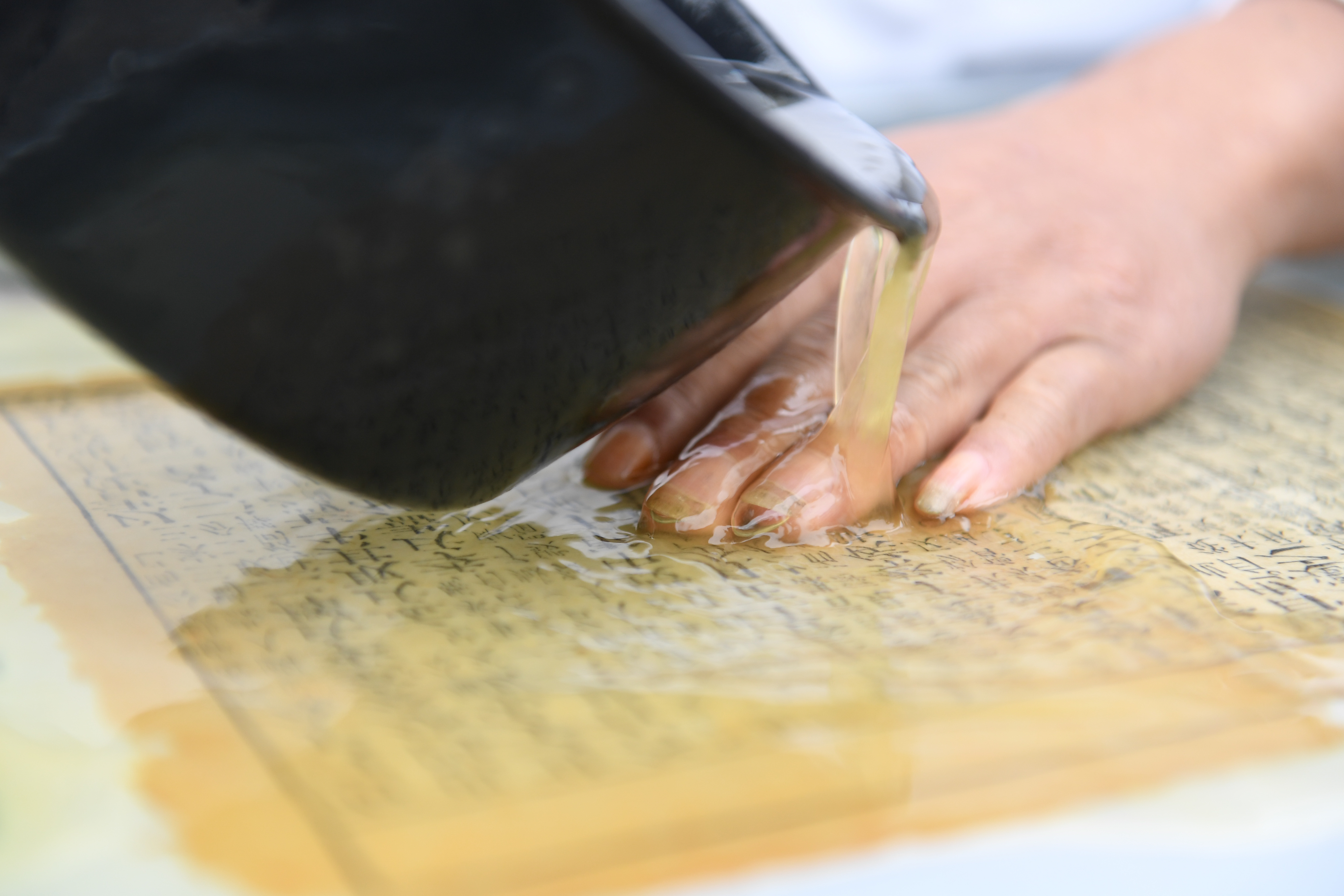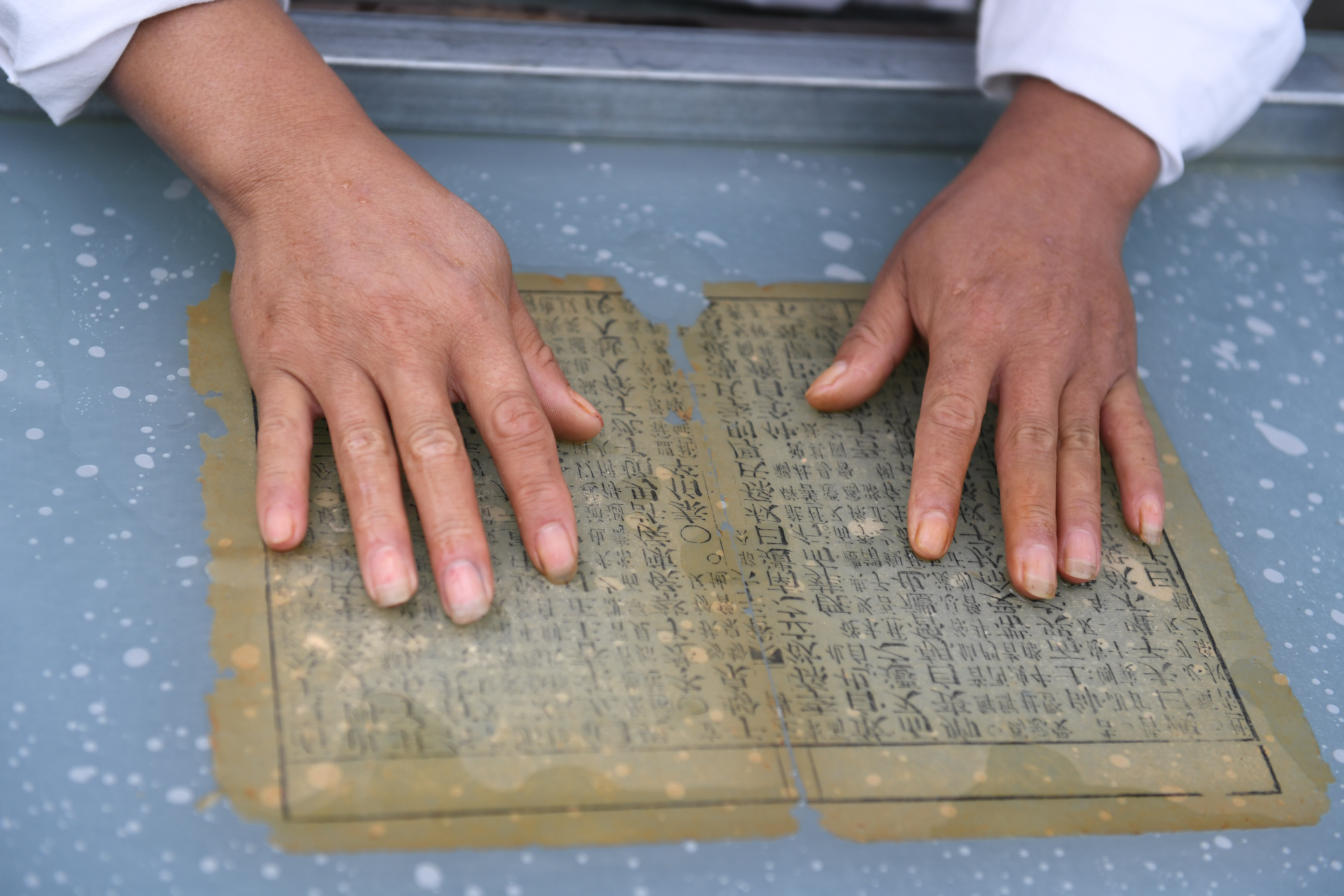 Cao Jianqin repairs pages of an ancient book at the Zijinlou Xuan paper factory in Jingxian County, Xuancheng City of east China's Anhui Province, Oct. 22, 2019. (Xinhua/Liu Junxi)