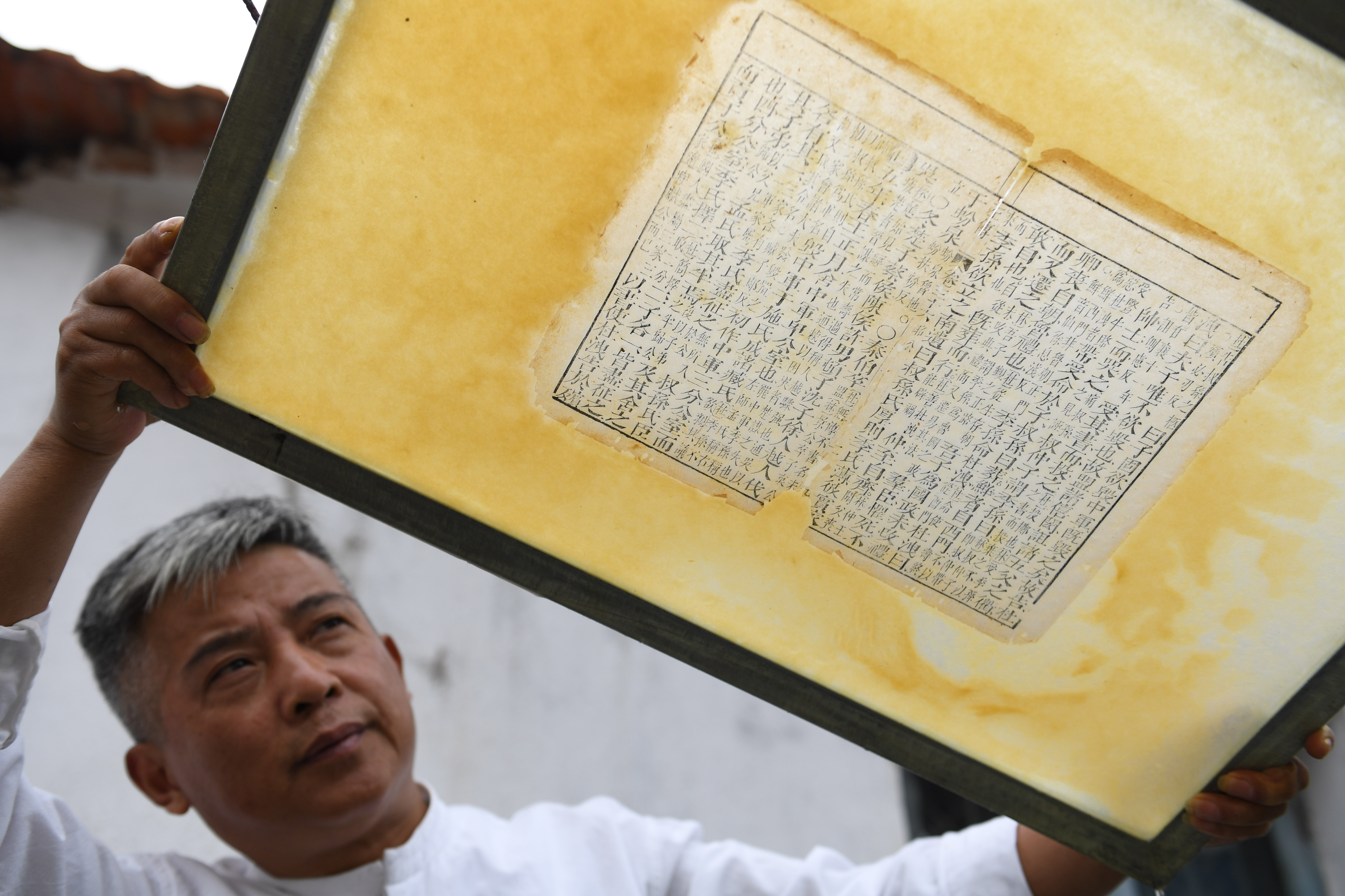 Cao Jianqin shows repaired pages of an ancient book at the Zijinlou Xuan paper factory in Jingxian County, Xuancheng City of east China's Anhui Province, Oct. 22, 2019. (Xinhua/Liu Junxi)