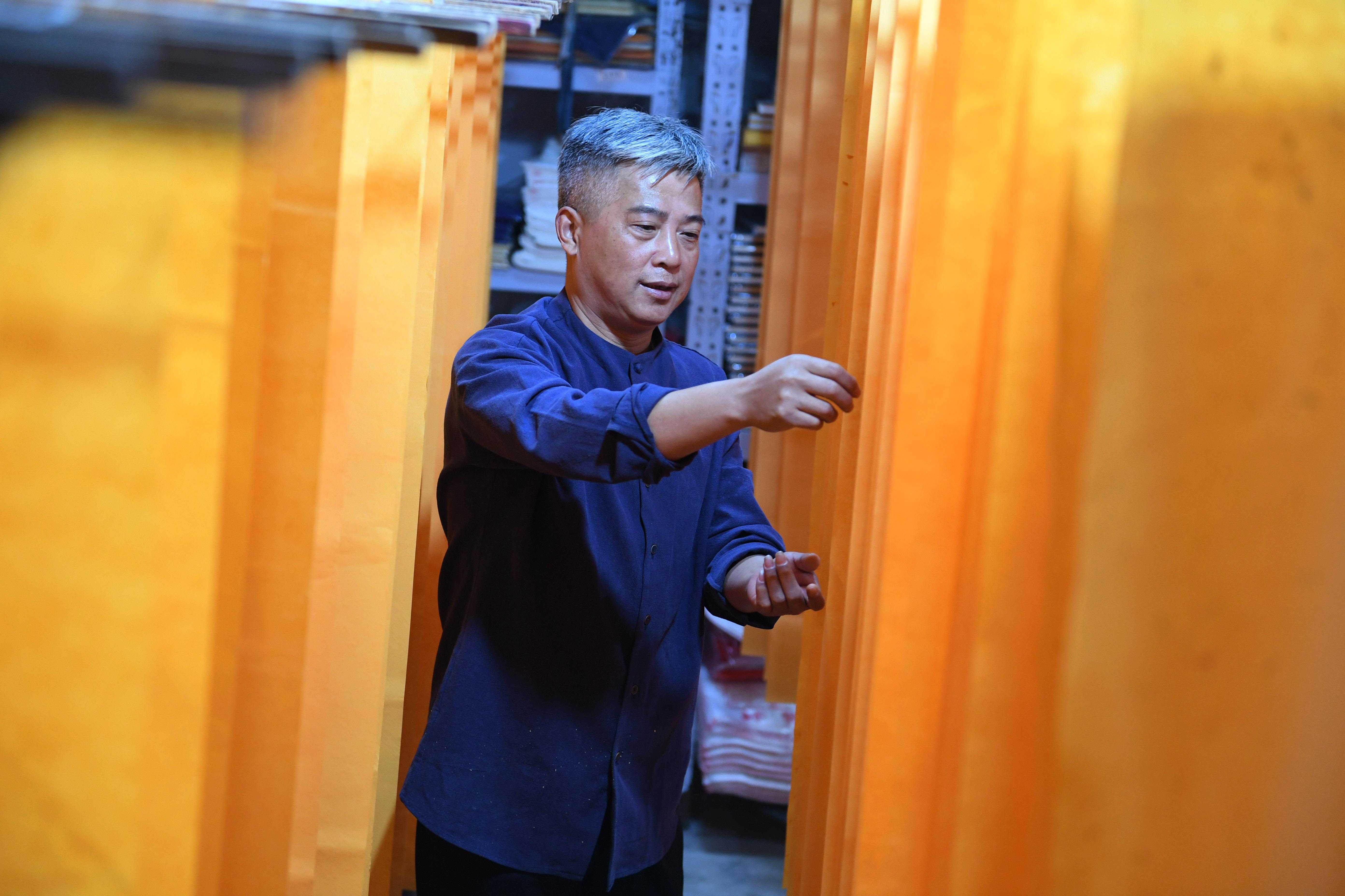 Cao Li, son of Cao Jianqin, has now become a good partner of his father in both of the making and selling of "Cao Family" Xuan paper. "I want to integrate the best of our time into the making of Xuan paper and make people know about it and pass it down in a better way," Cao Li said. (Xinhua/Liu Junxi)