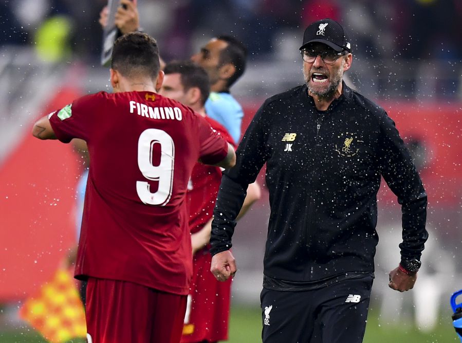 Roberto Firmino (L) of Liverpool FC celebrates with head coach Juergen Klopp after scoring a goal during the final of the FIFA Club World Cup Qatar 2019 against Flamengo in Doha, capital of Qatar, Dec. 21, 2019. (Xinhua/Nikku)