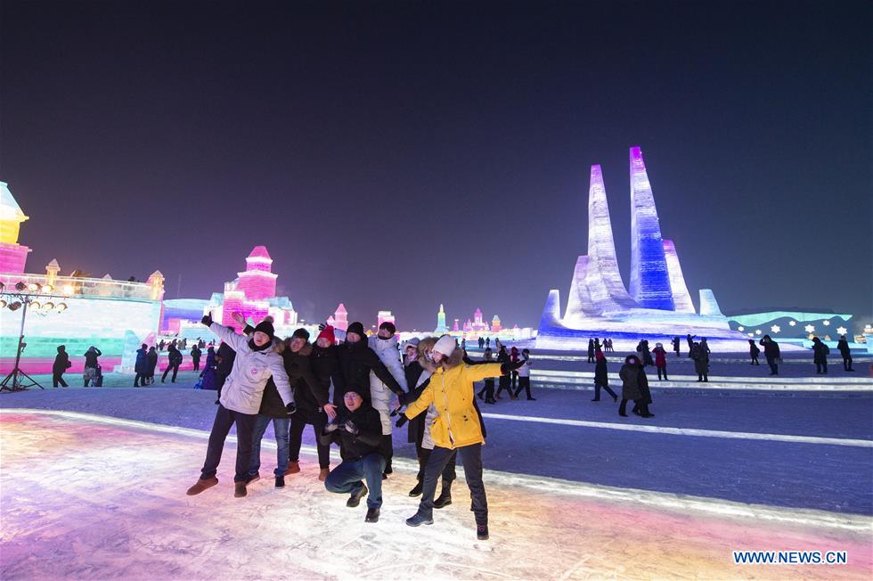 People pose for photos during the 21st edition of Ice-Snow World in Harbin, capital of northeast China's Heilongjiang Province, Dec. 23, 2019. (Photo by Xie Jianfei/Xinhua)