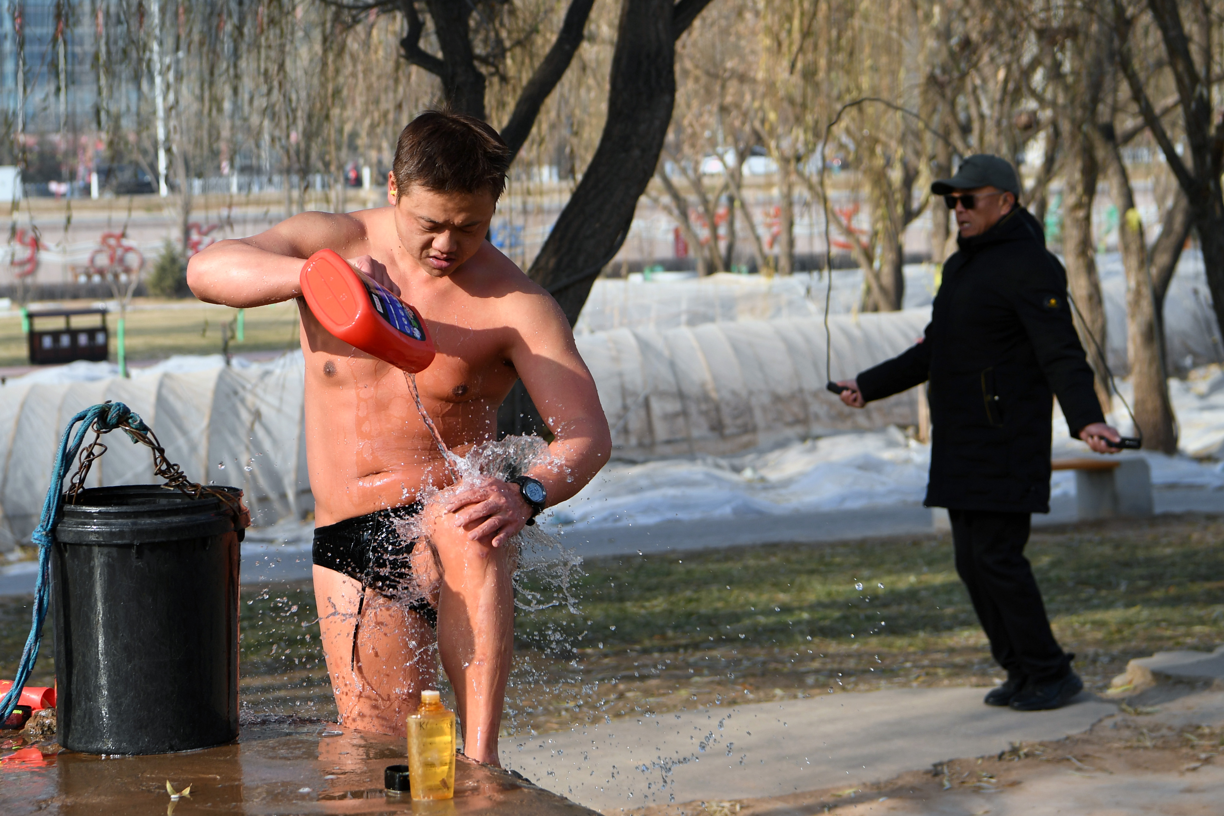 Zhang Minjie washes himself after a swim in the Yellow River in Lanzhou, northwest China's Gansu Province, Dec. 20, 2019. (Xinhua/Ma Ning)