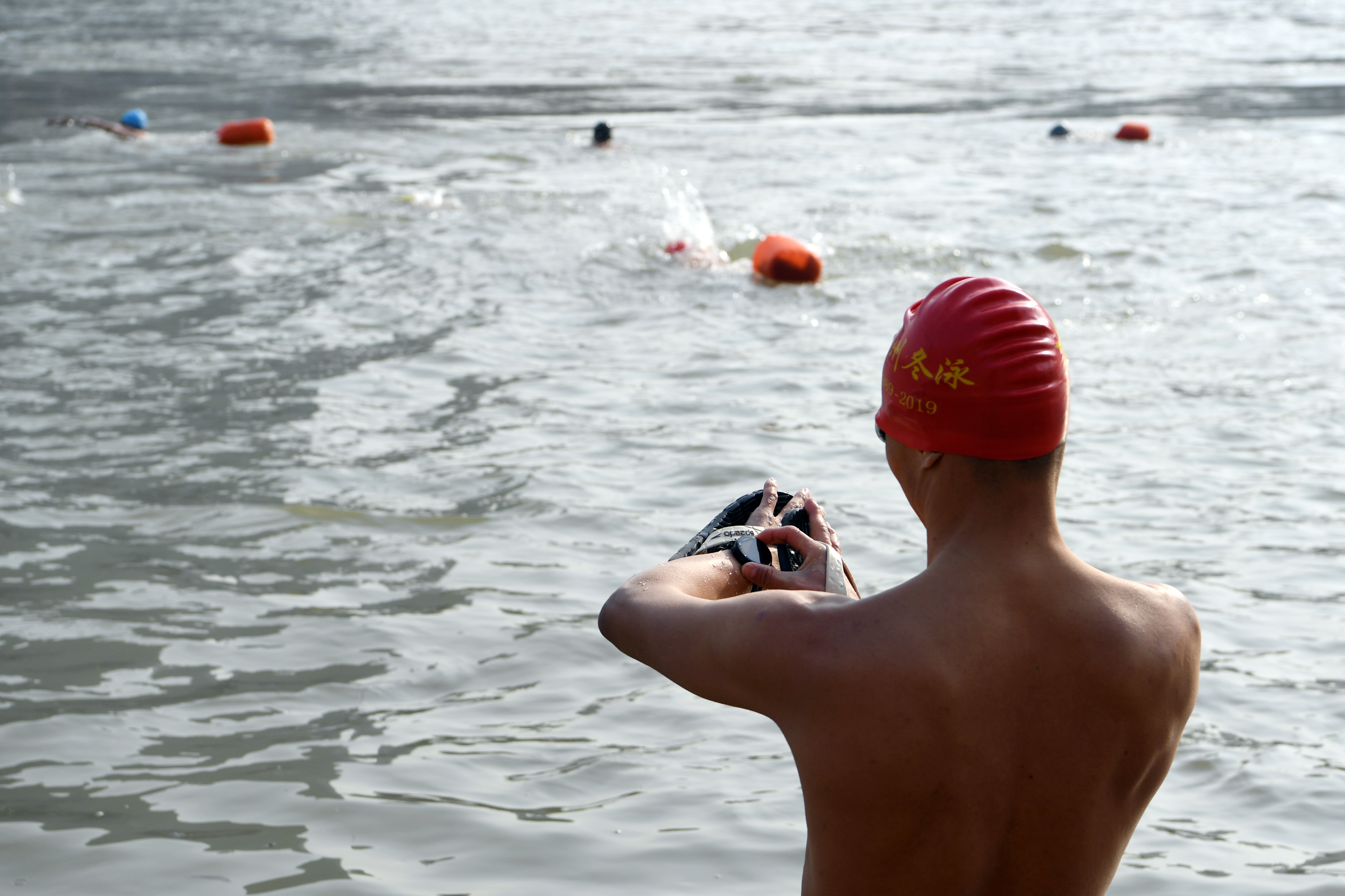 A winter swimmer sets up timing with his watch before swimming in the Yellow River in Lanzhou, northwest China's Gansu Province, Dec. 20, 2019. (Xinhua/Ma Ning)