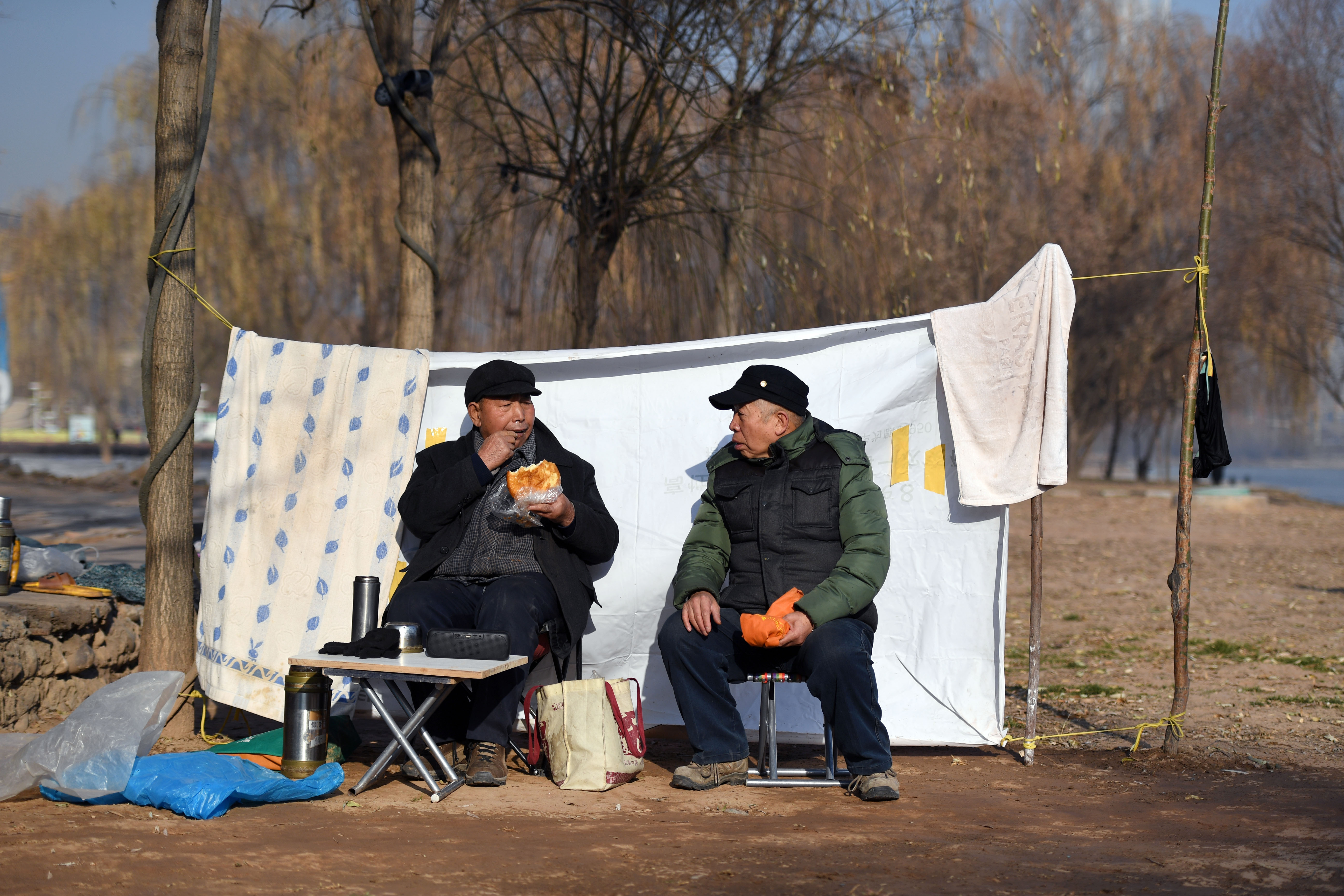 Shi Jincheng (L), 72-year-old, enjoys snacks and hot tea while listening to folk music and talking to his friend after swimming in the Yellow River in Lanzhou, northwest China's Gansu Province, Dec. 21, 2019. (Xinhua/Tao Xiyi)