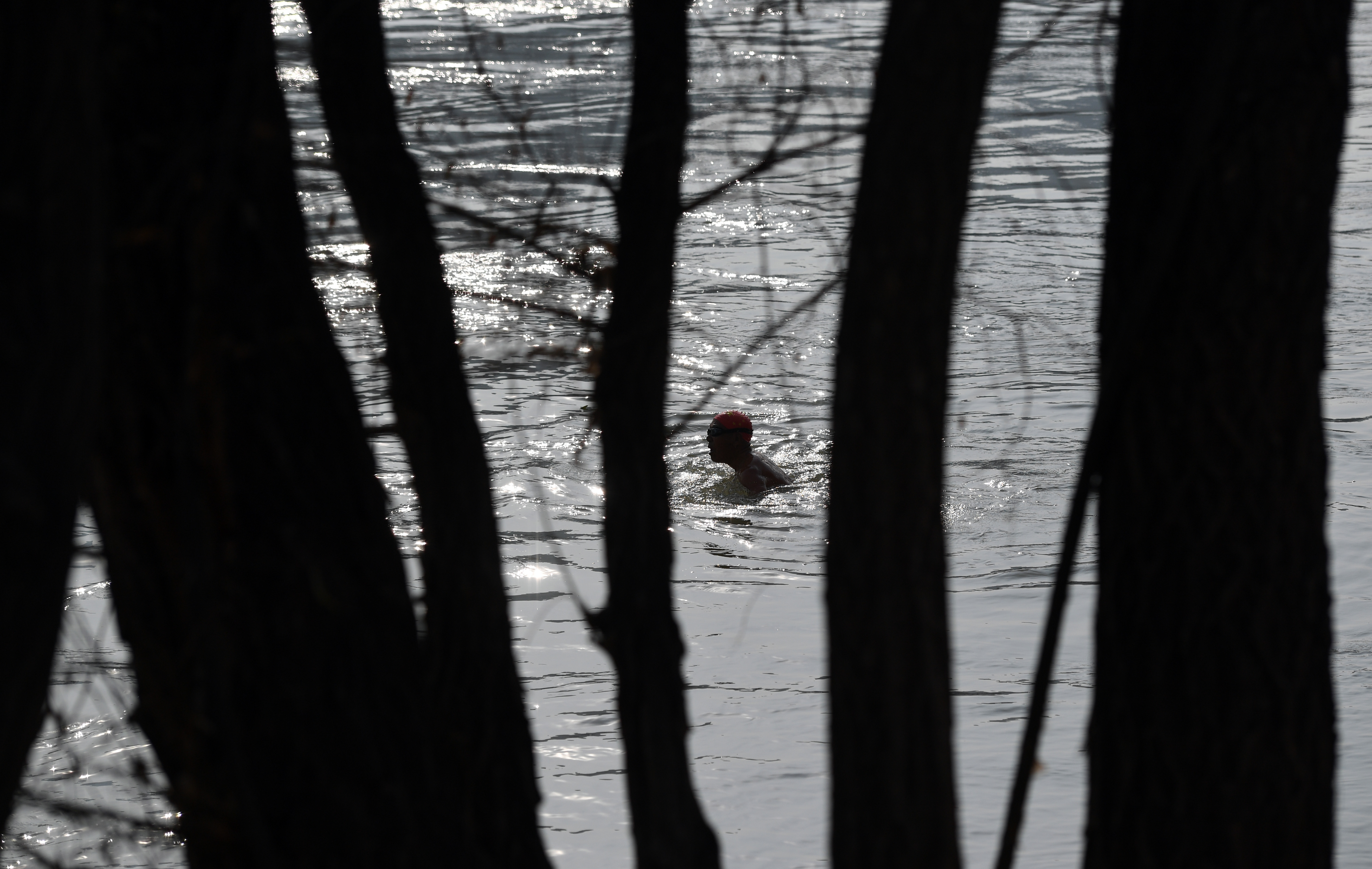 Zhao Xipu swims in the Yellow River in Lanzhou, northwest China's Gansu Province, Dec. 18, 2019. (Xinhua/Chen Bin)