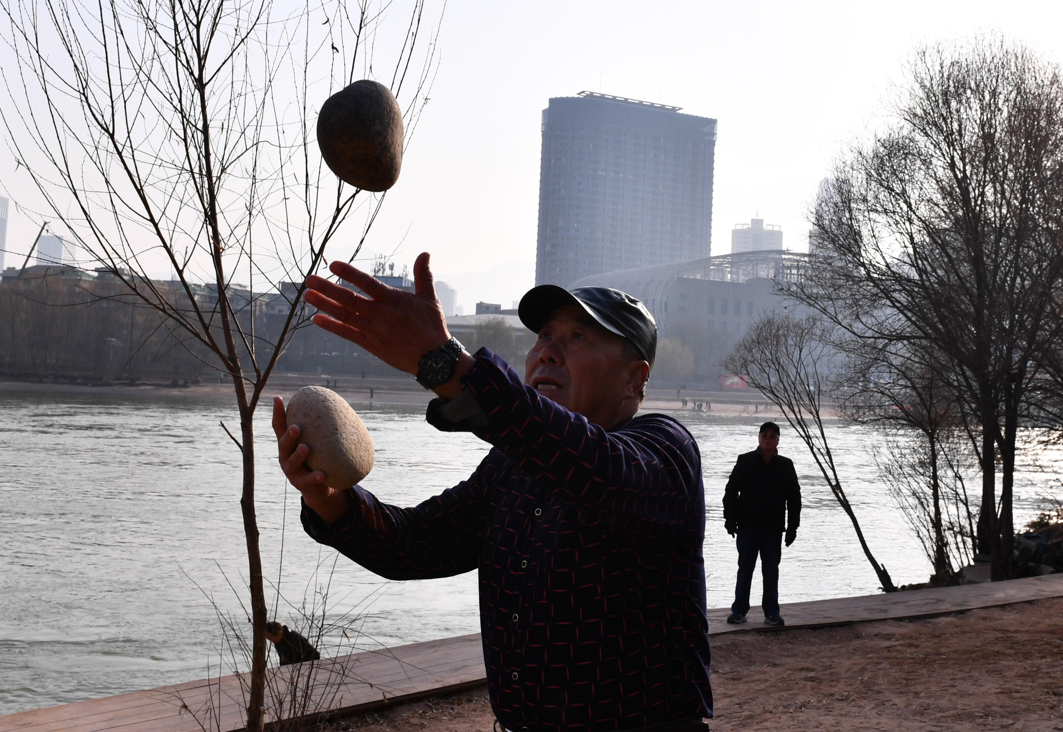 Zhao Ziyin juggles rocks to warm himself after swimming in the Yellow River in Lanzhou, northwest China's Gansu Province, Dec. 20, 2019. (Xinhua/He Changshan)