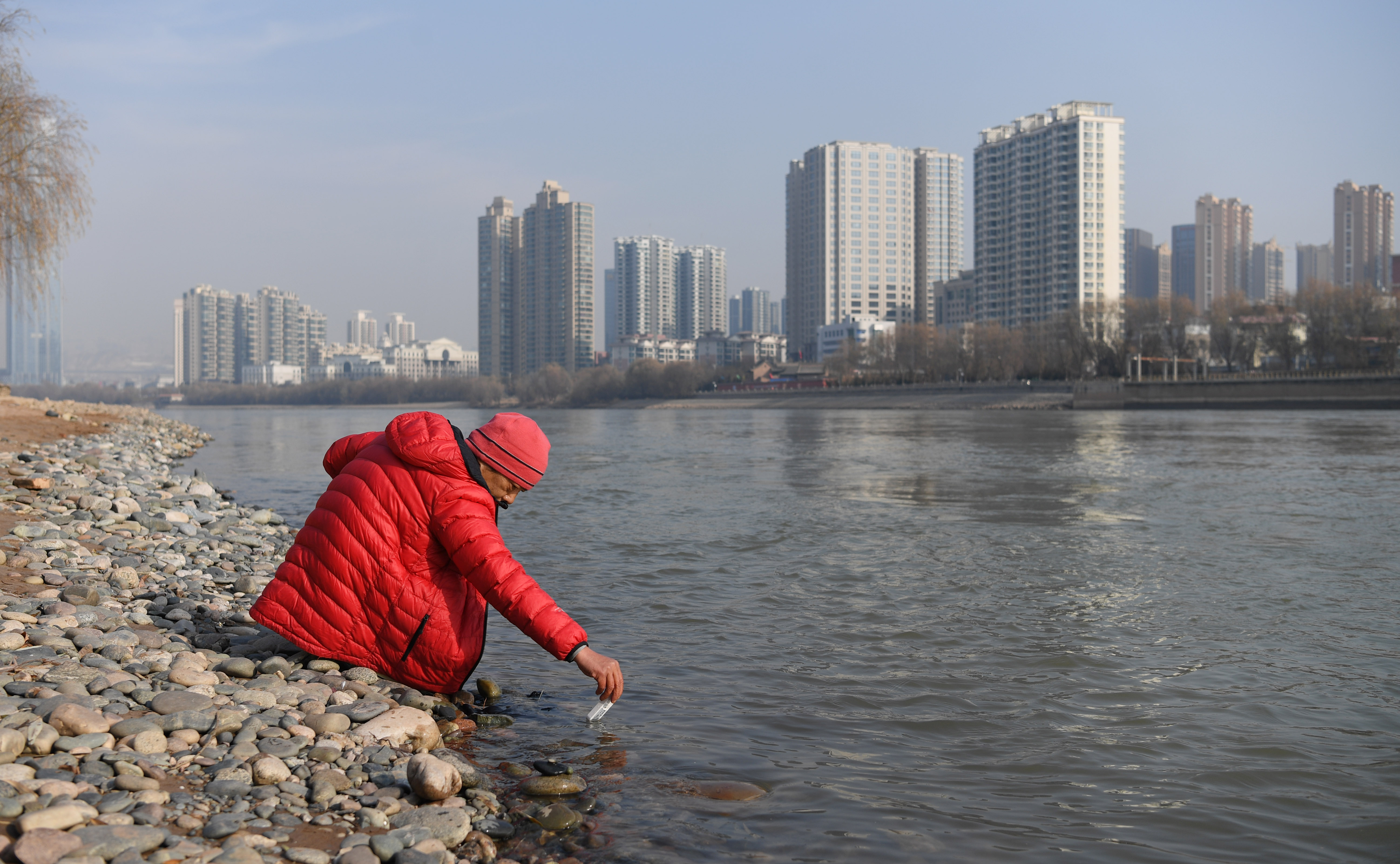 Meng Meng checks the water temperature with a thermometer before swimming in the Yellow River in Lanzhou, northwest China's Gansu Province, Dec. 20, 2019. (Xinhua/Tao Xiyi)