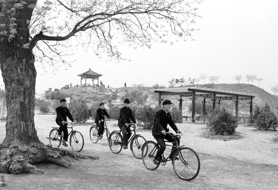 File photo taken on May 2, 1954 shows young men riding bicycles at the Taoranting Park in Beijing, capital of China. (Xinhua)