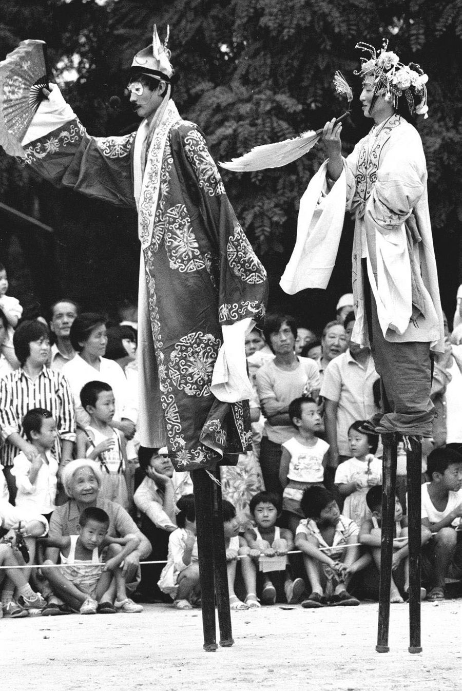 File photo taken on Sept. 13, 1987 shows performers walking on stilts at the Ritan Park in Beijing, capital of China. Urban parks in China offer easy place for people to relax and unwind. (Xinhua/Tang Shizeng)