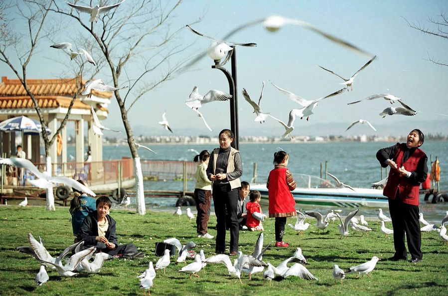 Visitors feed gulls at the Haigeng Park in Kunming, southwest China's Yunnan Province, Feb. 11, 2003. (Xinhua/Qin Qing)