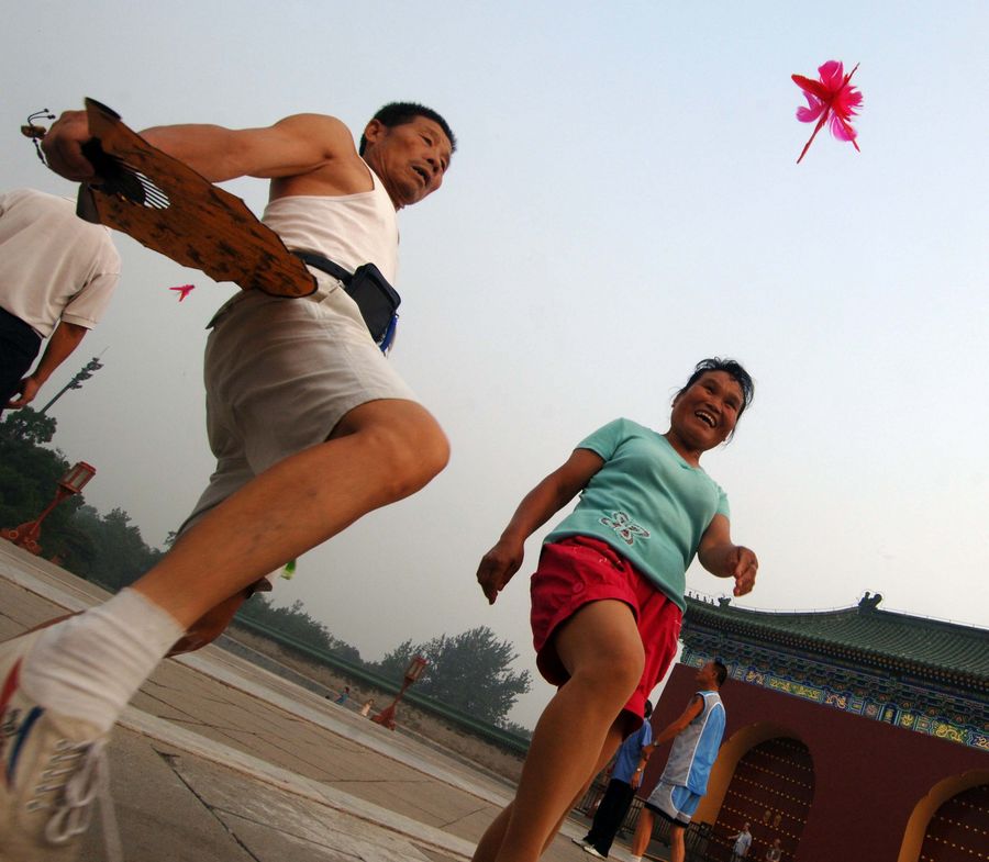 People play shuttlecock kicking at the Tiantan Park in Beijing, capital of China, Aug. 8, 2006. (Xinhua/Li Wen)