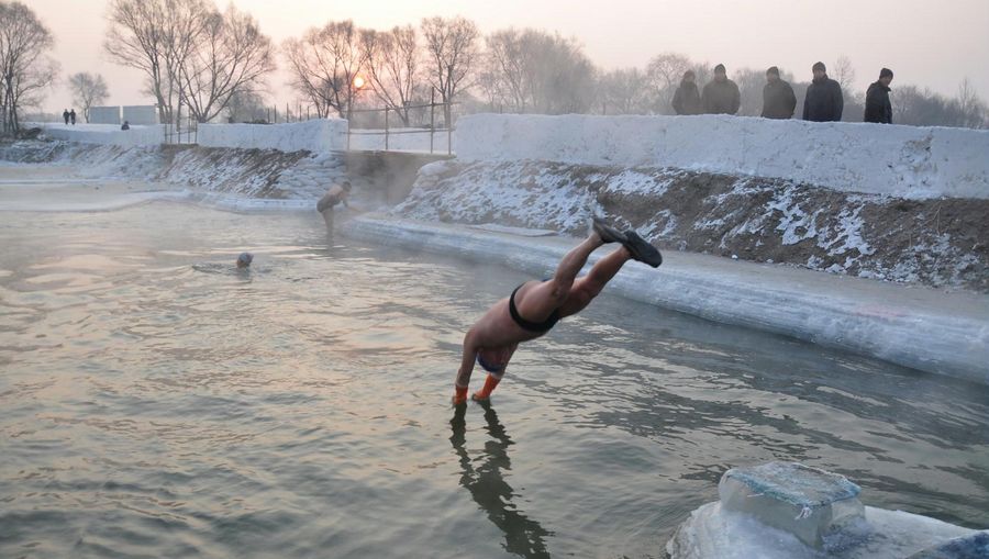An enthusiast of winter swimming jumps into the river at a park in Mudanjiang, northeast China's Heilongjiang Province, Jan. 1, 2012. (Photo by Zhang Chunxiang/Xinhua)