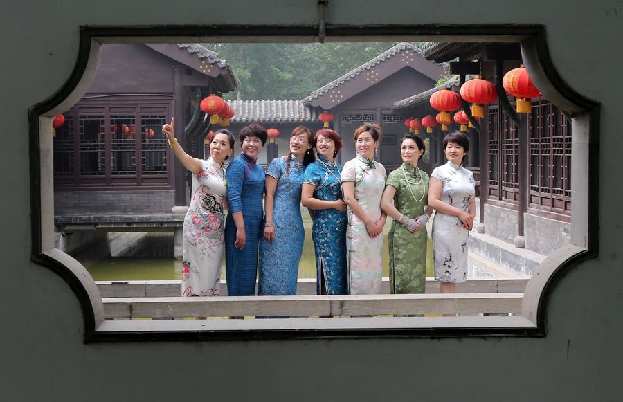 Enthusiasts of cheongsam, a traditional Chinese women's dress also known as Qipao, perform during a show at the Renmin Park in Weifang City, east China's Shandong Province, May 3, 2015. (Photo by Zhang Chi/Xinhua)