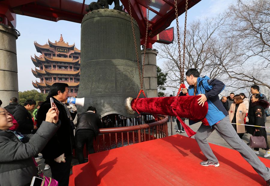 A visitor strikes the big bell at the Huanghelou Park in Wuhan, central China's Hubei Province, Feb. 5, 2019. (Photo by Zhou Guoqiang/Xinhua)