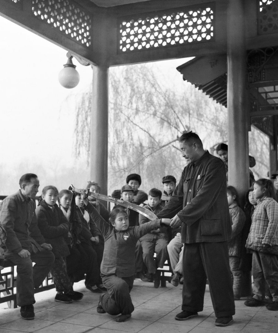 File photo taken in December 1961 shows a girl learning Wushu, the Chinese martial arts, with a scimitar at the Beining Park in Tianjin, north China. (Xinhua/Zhang Yinghua)