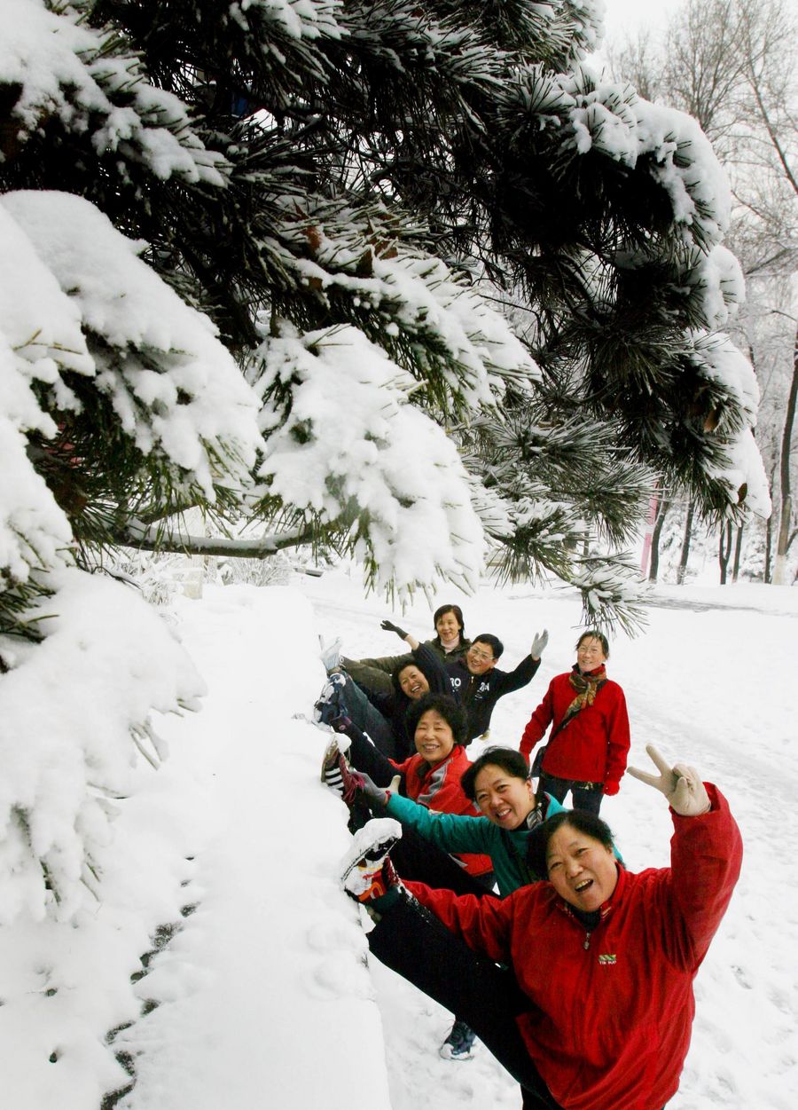 Women take morning exercises after snowfall at the Hongshan Park in Urumqi, northwest China's Xinjiang Uygur Autonomous Region, Nov. 23, 2006. (Photo by Li Xiongxin/Xinhua)