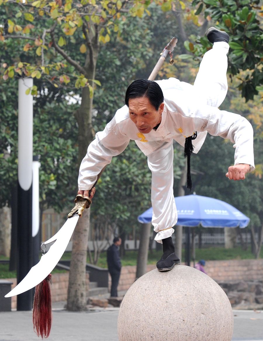 A man practices Wushu, the Chinese martial arts, with a broadsword at a park in Suzhou, east China's Jiangsu Province, Nov. 8, 2012. (Photo by Wang Jianzhong/Xinhua)