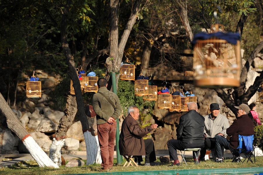 People enjoy fresh air with their birds at the Zhongshan Park in Yinchuan, northwest China's Ningxia Hui Autonomous Region, Oct. 26, 2014. (Xinhua/Peng Zhaozhi)