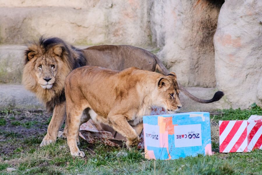 African lions look into Christmas gift packages at Zagreb Zoo in Zagreb, capital of Croatia, on Dec. 26, 2019. (Tomislav Miletic/Pixsell via Xinhua)