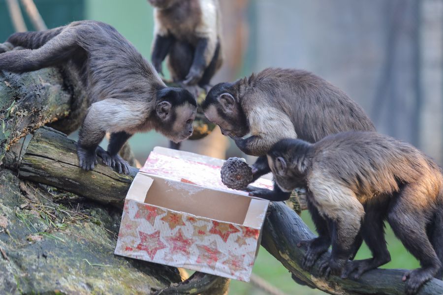 Capuchin monkeys look into a Christmas gift package at Zagreb Zoo in Zagreb, capital of Croatia, on Dec. 26, 2019. (Tomislav Miletic/Pixsell via Xinhua)■
