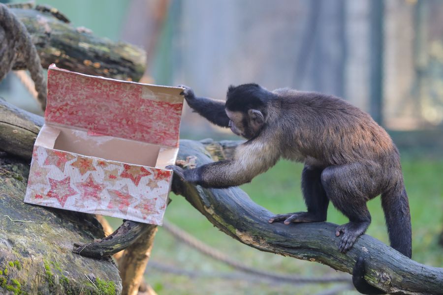 A capuchin monkey looks into a Christmas gift package at Zagreb Zoo in Zagreb, capital of Croatia, on Dec. 26, 2019. (Tomislav Miletic/Pixsell via Xinhua)