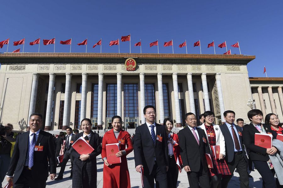 Deputies to the 13th National People's Congress walk out from the Great Hall of the People after the closing meeting of the second session of the 13th National People's Congress, March 15, 2019. (Xinhua/Yang Zongyou)
