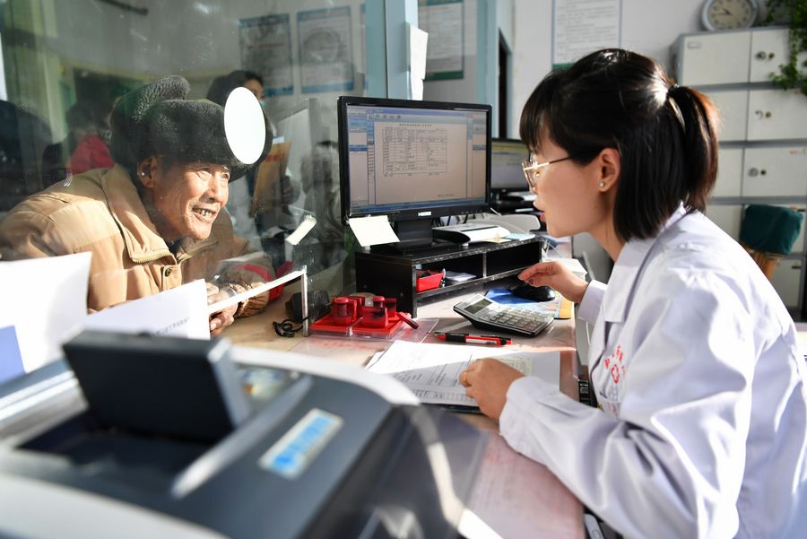 A staff member helps a patient with his check-out procedure in a hospital in Dunhuang, northwest China's Gansu Province, Dec. 19, 2019. (Xinhua/Chen Bin)