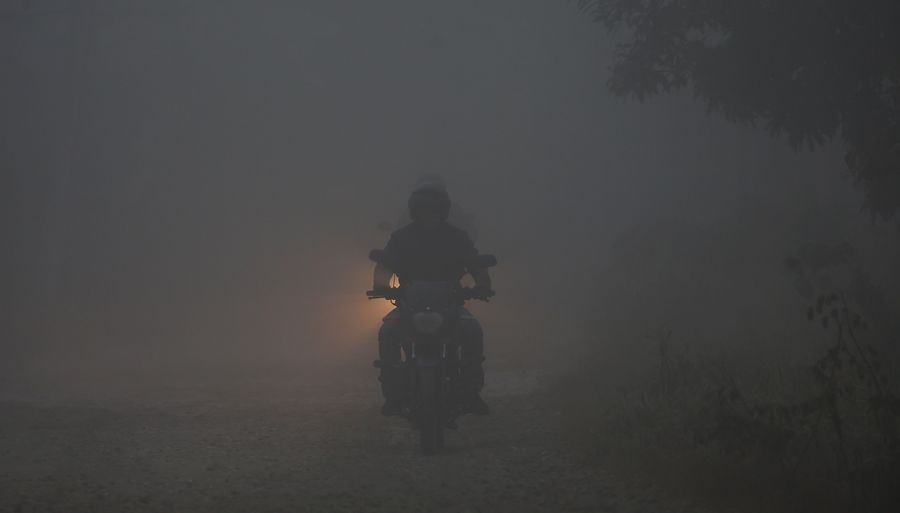 A motorcycle rider passes through foggy winter morning at Sauraha in Chitwan, Nepal, Dec. 28, 2019. (Xinhua/Sunil Sharma)