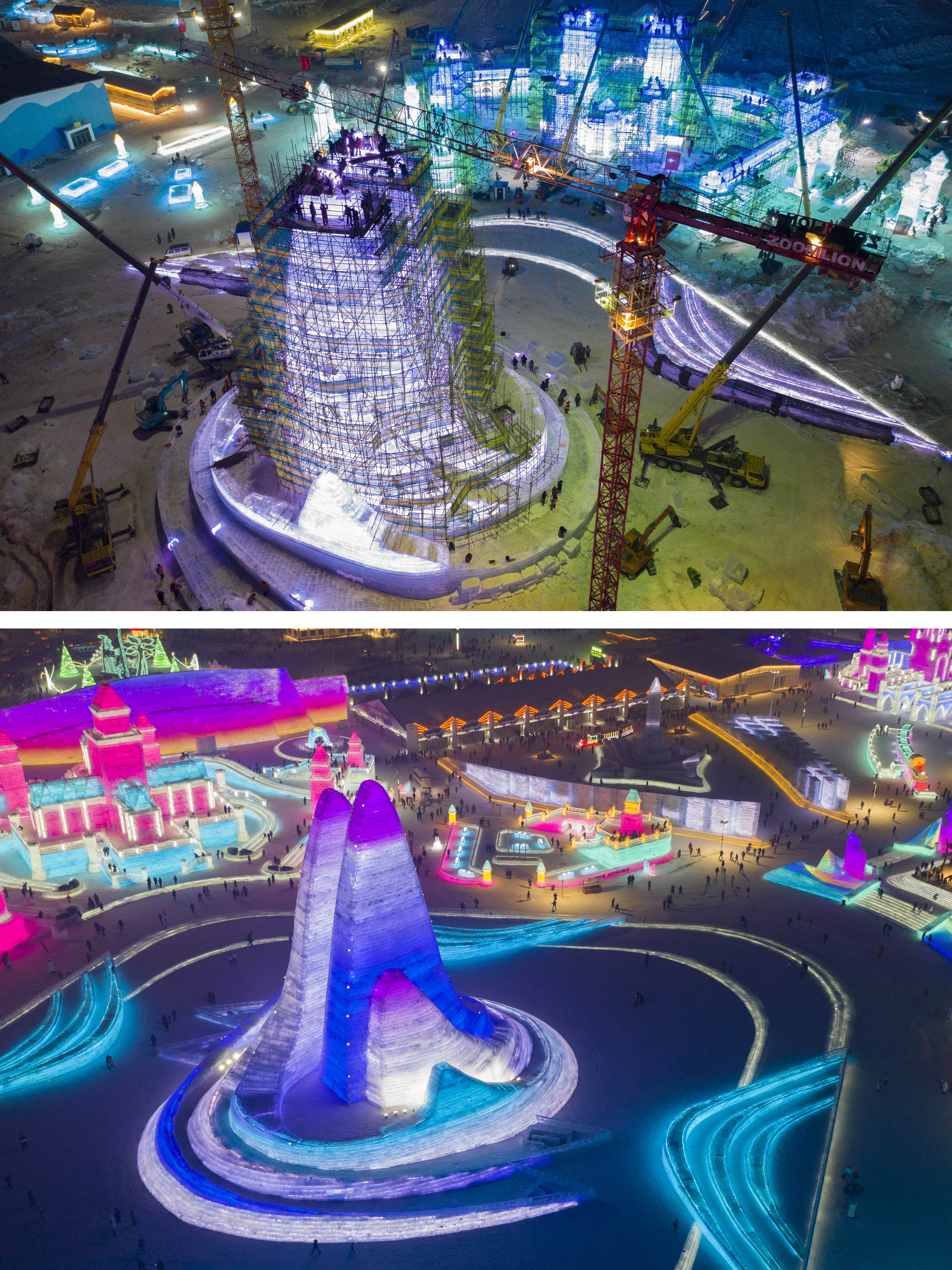 Combo photo shows aerial views of the Ice-Snow World in construction on Dec. 15, 2019 (upper) and after its opening on Dec. 23, 2019 in Harbin, capital of northeast China's Heilongjiang Province. (Xinhua/Xie Jianfei)