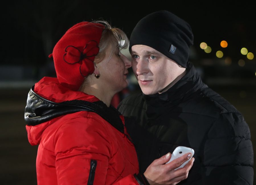 A released Ukrainian is greeted at the Boryspil International Airport in Kiev, capital of Ukraine, Dec. 29, 2019. (Photo by Sergey Starostenko/Xinhua)