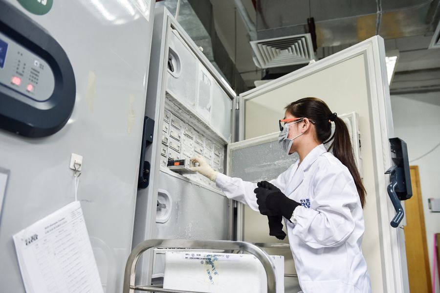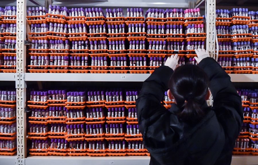 A file photo shows a staff member placing the blood samples at the China National GeneBank in Shenzhen, south China's Guangdong Province. (Xinhua/Mao Siqian)