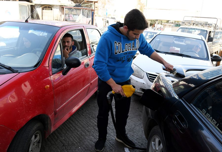Syrians line up to fill their cars up with petrol at a gas station in Damascus, Syria, on April 23, 2019. (Xinhua/Ammar Safarjalani)