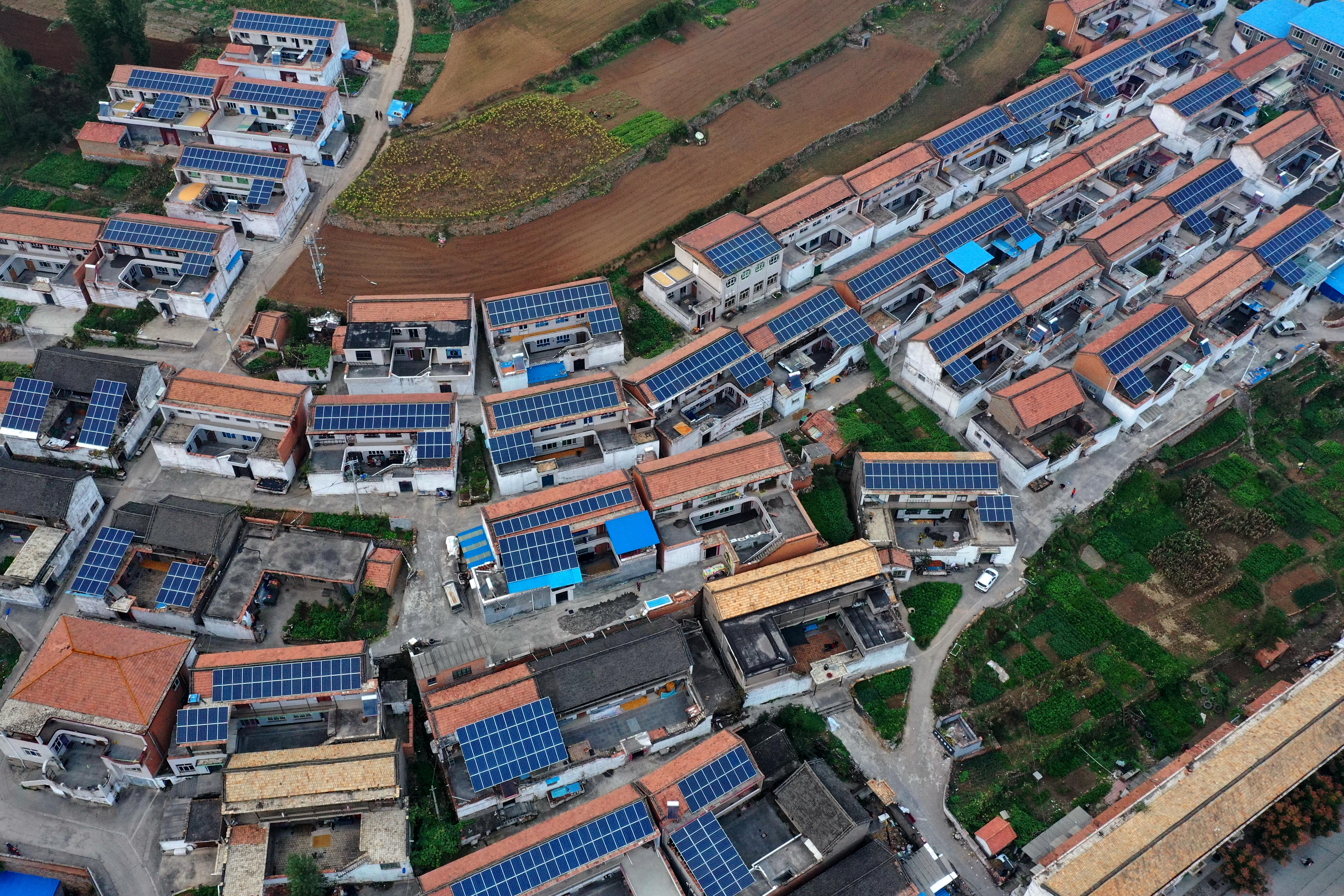 Aerial photo taken on Oct. 13, 2019 shows photovoltaic power panels installed on roofs of residential houses in Hebei Village of Jincheng City, north China's Shanxi Province. As one of the poverty-alleviation measures, local government built photovoltaic power stations in 211 villages to help villagers increase their income with earning from the generated electricity. (Xinhua/Cao Yang)