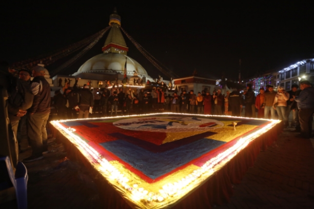 Nepalese people light butter lamps during Visit Nepal 2020 campaign at the World heritage site Boudhanath Stupa in Kathmandu, Nepal on Jan. 2, 2020. (Xinhua/ Sulav Shrestha)