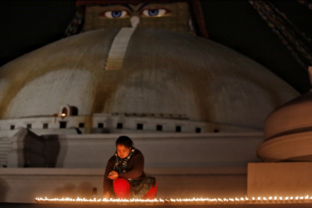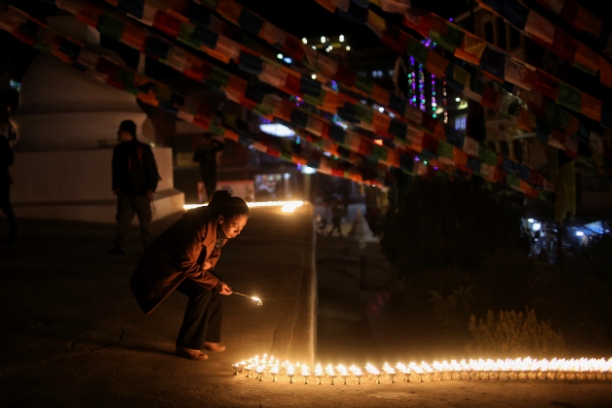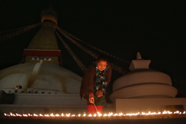 A Nepalese woman lights butter lamps during Visit Nepal 2020 campaign at the World heritage site Boudhanath Stupa in Kathmandu, Nepal on Jan. 2, 2020. (Xinhua/ Sulav Shrestha)