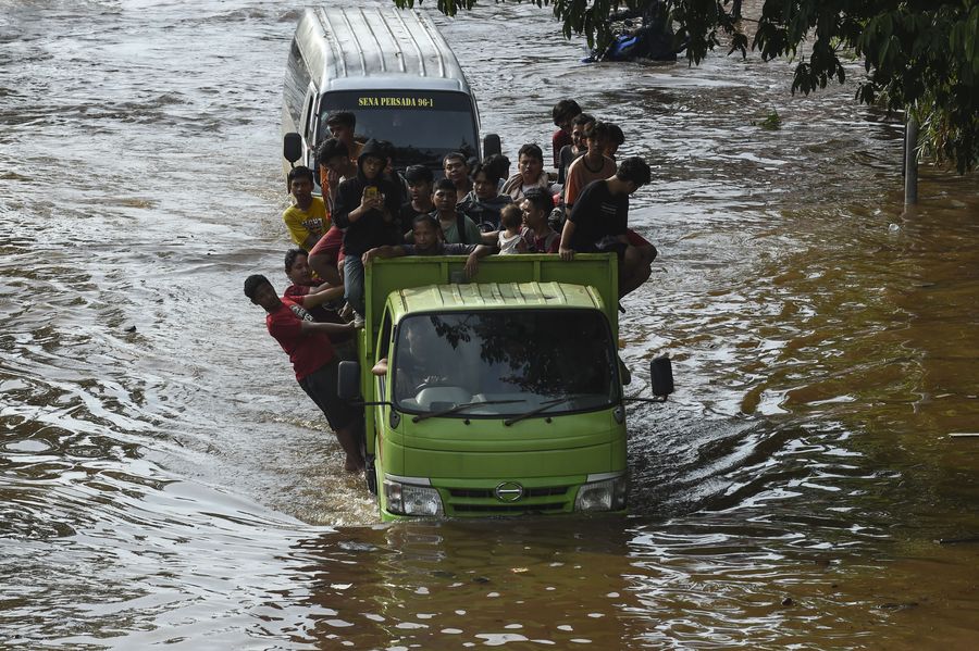 People ride a truck through a flooded street in Jakarta, Indonesia, Jan. 2, 2020. (Xinhua/Agung Kuncahya B.)