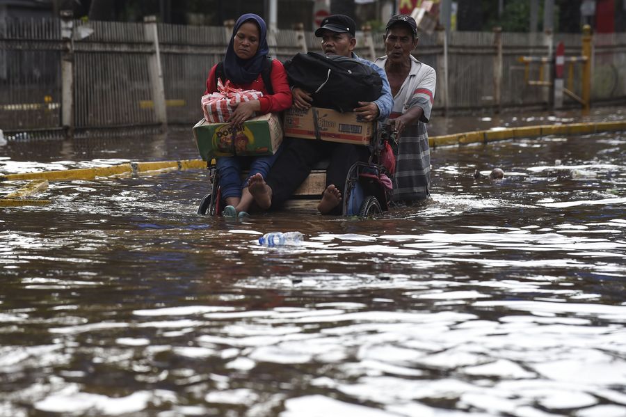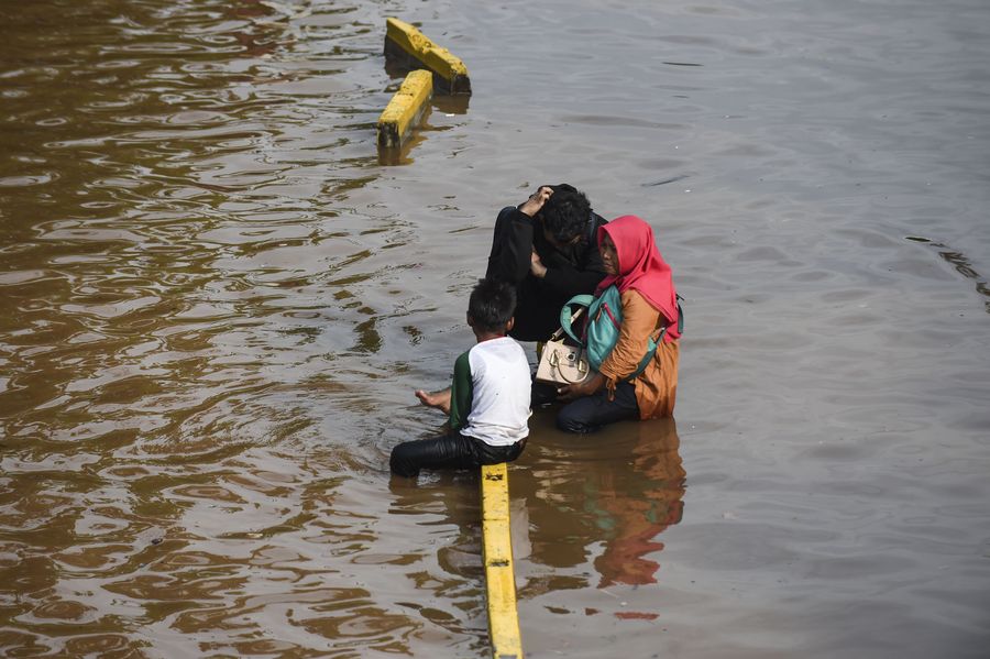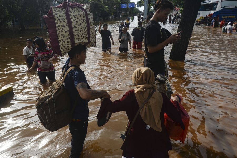 People wade through flood water in Jakarta, Indonesia, Jan. 2, 2020. (Xinhua/Agung Kuncahya B.)