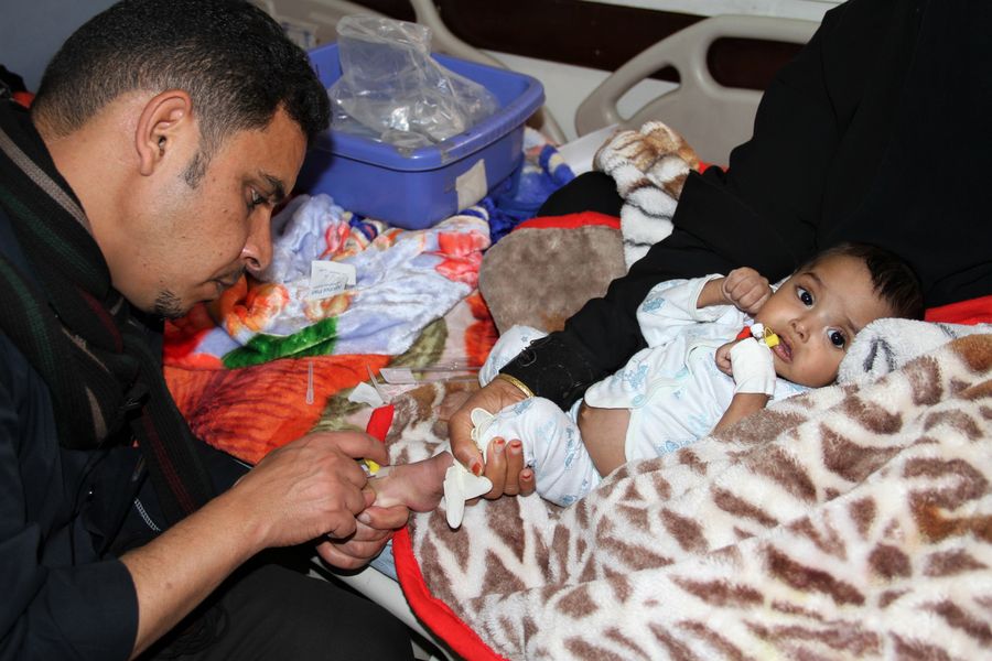 A doctor checks a baby as he receives chemotherapy at the National Oncology Center in Sanaa, Yemen, Jan.1, 2020. (Xinhua/Adel Bishr)
