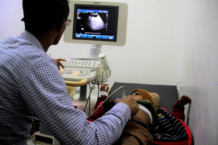 A doctor checks a child who suffers from bowel cancer at the National Oncology Center in Sanaa, Yemen, Jan.1, 2020. (Xinhua/Adel Bishr)
