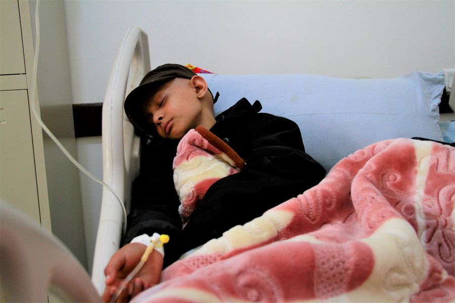 A child lies in bed as he receives chemotherapy at the National Oncology Center in Sanaa, Yemen, Jan.1, 2020. (Xinhua/Adel Bishr)