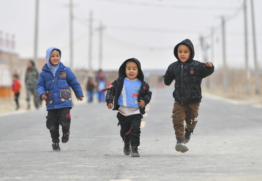 Students are seen on their way home after the class at the new campus of Daliyaboyi Township School in Daliyaboyi Township of Yutian County, northwest China's Xinjiang Uygur Autonomous Region, Nov. 18, 2019. (Xinhua/Hu Huhu)