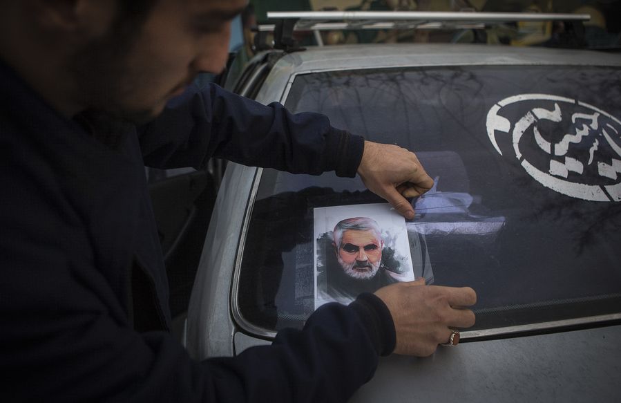 A man puts a poster of top Iranian commander Qassem Soleimani on his car in Tehran, Iran, on Jan. 3, 2020. A U.S. airstrike near Baghdad International Airport on Friday killed top Iranian commander Soleimani. (Photo by Ahmad Halabisaz/Xinhua)