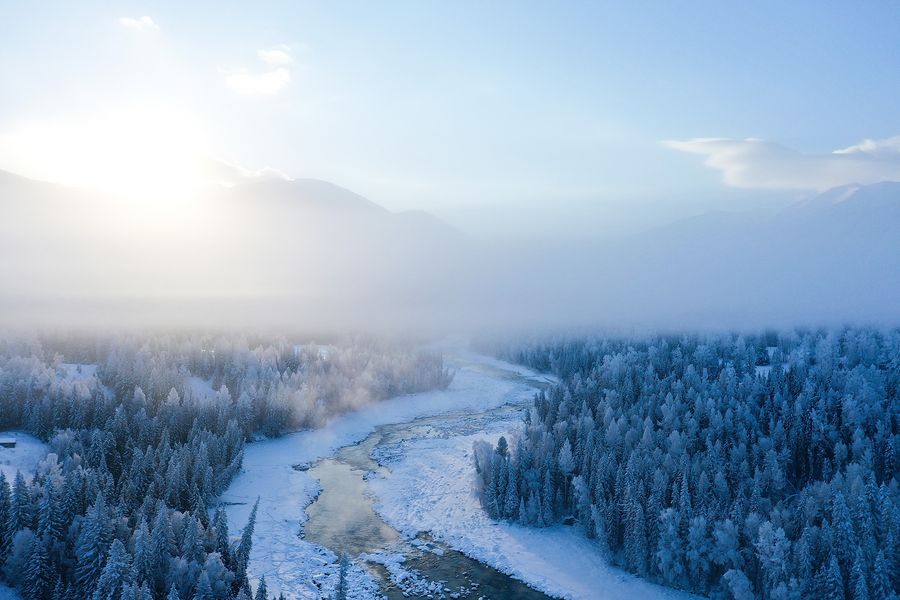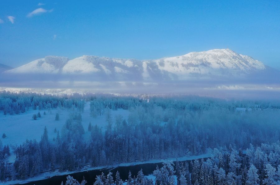 Aerial photo taken on Jan. 3, 2020 shows the morning scenery of the Kanas River at Kanas scenic area in Altay, northwest China's Xinjiang Uygur Autonomous Region. (Xinhua/Song Yanhua)