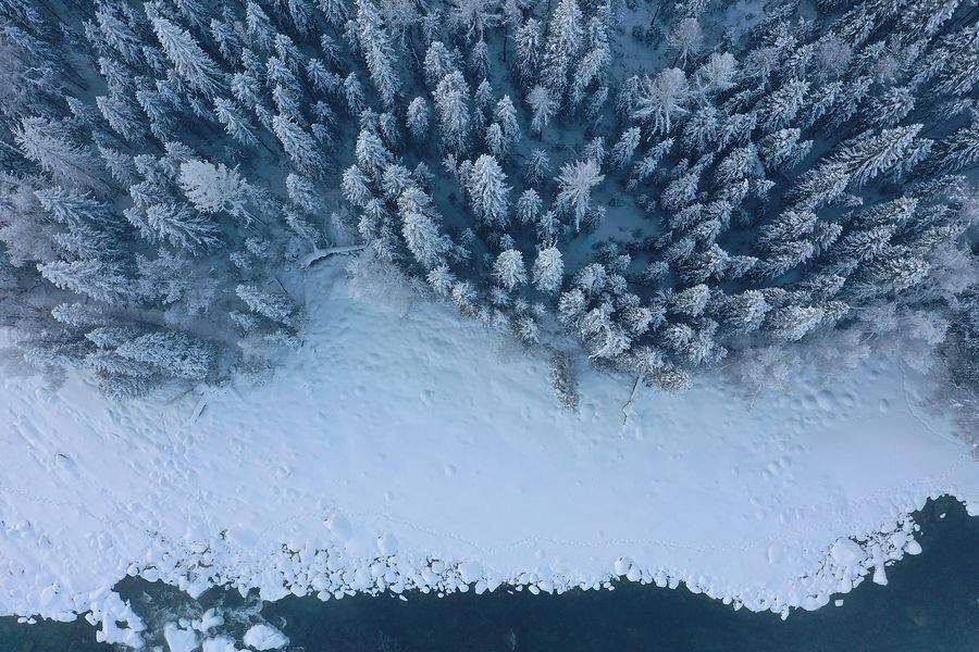 Aerial photo taken on Jan. 3, 2020 shows the scenery of rime-covered trees along the Kanas River at Kanas scenic area in Altay, northwest China's Xinjiang Uygur Autonomous Region. (Xinhua/Song Yanhua)■