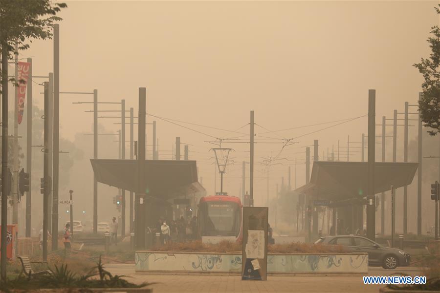 A light-rail station is shrouded in bushfire smoke in Canberra, Australia, Jan. 5, 2020. Australia's bushfire crisis, which has seen more than 1,500 homes destroyed and at least 23 confirmed deaths according to The Australian newspaper, were expected to be exacerbated by catastrophic conditions forecast for Saturday. (Photo by Chu Chen/Xinhua)