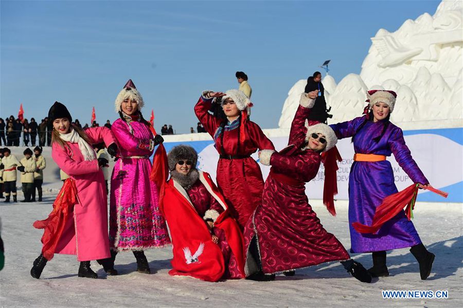 Performers pose for photos on the opening ceremony of the 13th winter fishing and traveling festival at Dali Nur in Chifeng, north China's Inner Mongolia Autonomous Region, Jan. 5, 2020. (Photo by Li Zhipeng/Xinhua)