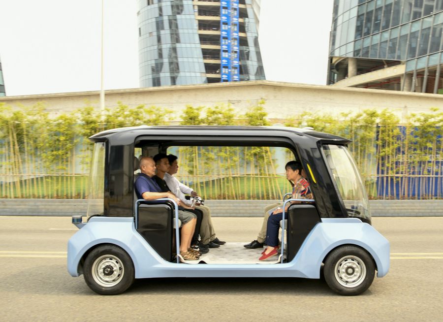 A competition car of i-Vista Self-driving Cars Challenge carrying citizens runs on a road during an experience day event in southwest China's Chongqing Municipality, Aug. 28, 2019. A two-day experience event for 5G self-driving cars kicked off in Chongqing during the ongoing 2019 Smart China Expo. (Xinhua/Liu Chan)