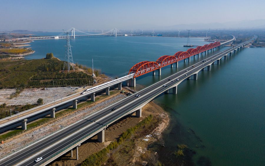 A high-speed train running on the Guanting Lake Bridge section of Beijing-Zhangjiakou high-speed railway in Zhangjiakou, north China's Hebei Province, Oct. 27, 2019. (Xinhua/Yang Shiyao)