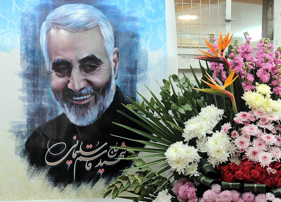 A portrait of the late Iranian senior general Qassem Soleimani is seen at the Iranian embassy in Damascus, Syria, on Jan. 5, 2020. (Xinhua/Ammar Safarjalani)